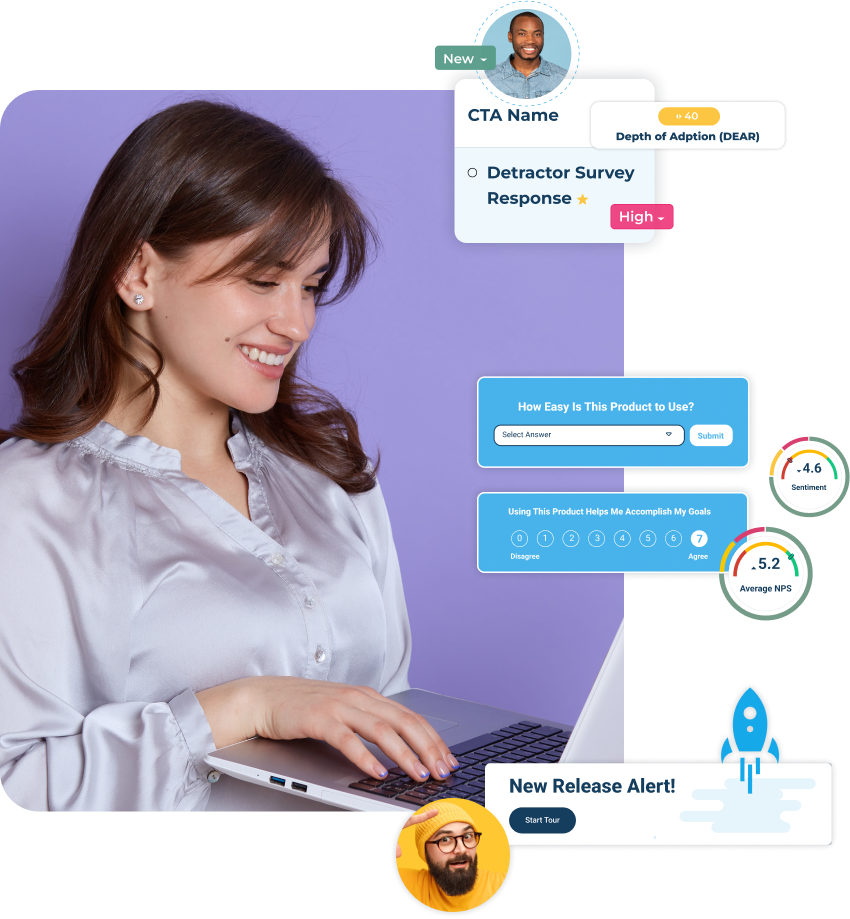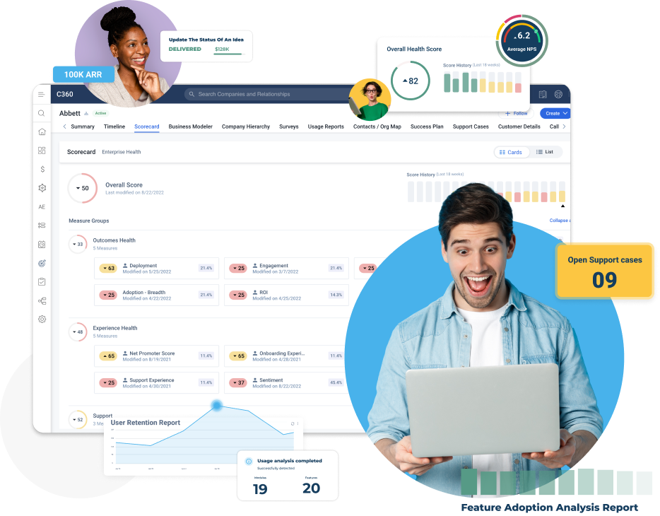 Analyze customer health with easy-to-understand scores for sentiment, risk signals, NPS, engagement, and feature usage at multiple levels