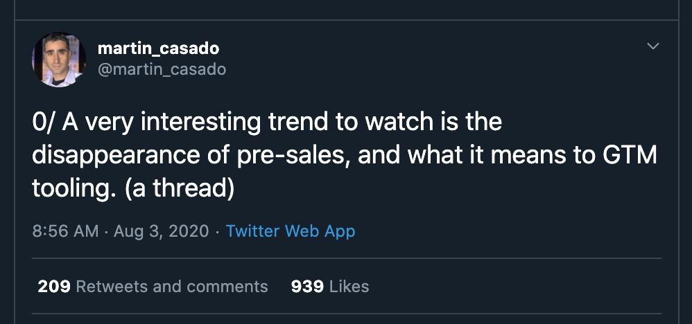 Martin Casado, former entrepreneur and current General Partner at Venture Capital firm Andreessen Horowitz, posted a thoughtful tweetstorm a few weeks ago. Through the series of tweets, he argued that as cloud and SaaS technology business models become mainstream, the notions of “pre-sales” and “post-sales” have become antiquated: