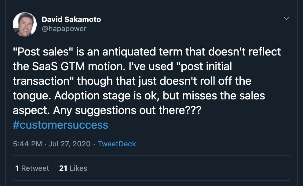 Just a week earlier, David Sakamoto, Vice President of Customer Success at GitLab, had a similar thought from the “post-sales” perspective:
