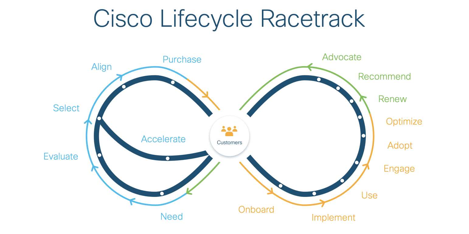 Maria Martinez, EVP and Chief Experience Officer (CXO) at Cisco, and former head of Customer Success at Salesforce, opted for a “figure eight” diagram that she calls the “race track”: