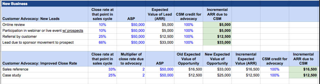 Let’s take a look at the CSM department as an example. CSMs drive New Business by generating new leads and by providing sales references and customer case studies that improve close rates. Once you analyze your close rates by lead source and how those change when a sales reference or case study is used, you can calculate the incremental New Business ARR resulting from the CSM team’s advocacy efforts.
