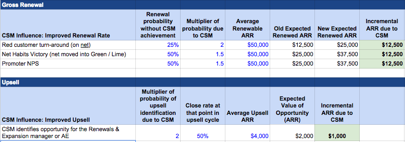 Because this framework assigns a value to CSMs’ influence of a metric that they are not normally held accountable for, the framework allows us to return to the question initially posed in this email: what’s the ROI of Customer Success?