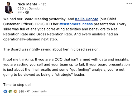 As a result, as they say “with great power comes great responsibility.” Just as any revenue leader does, customer success executives have an even greater responsibility to bring the same level of operational excellence, rich data-driven business insights, and a bias for action into every strategic meeting.