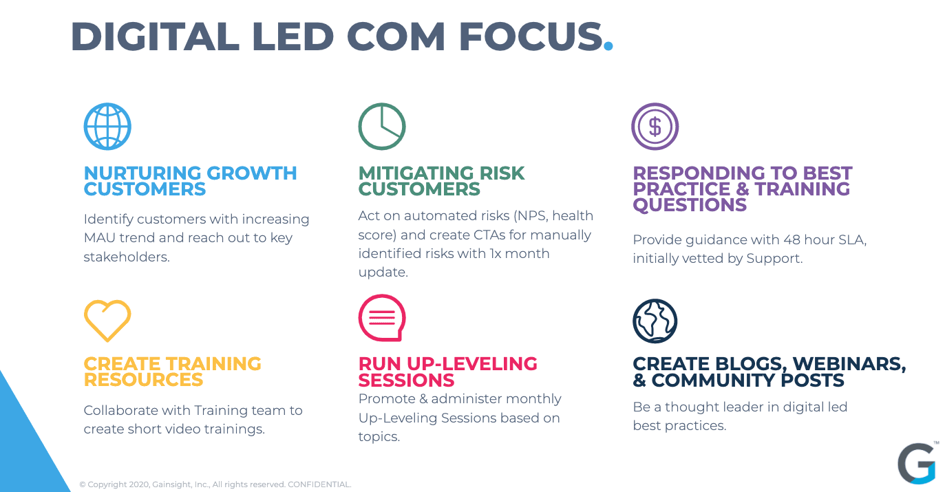 It’s also essential to prioritize tech-touch activities that can be done at scale. They may be one-to-many customer meetings or webinars covering product adoption and best practices. There are also blanket contact campaigns of monthly or quarterly e-newsletters, data triggered email campaigns, on-demand training and guidance, and access to a community portal.