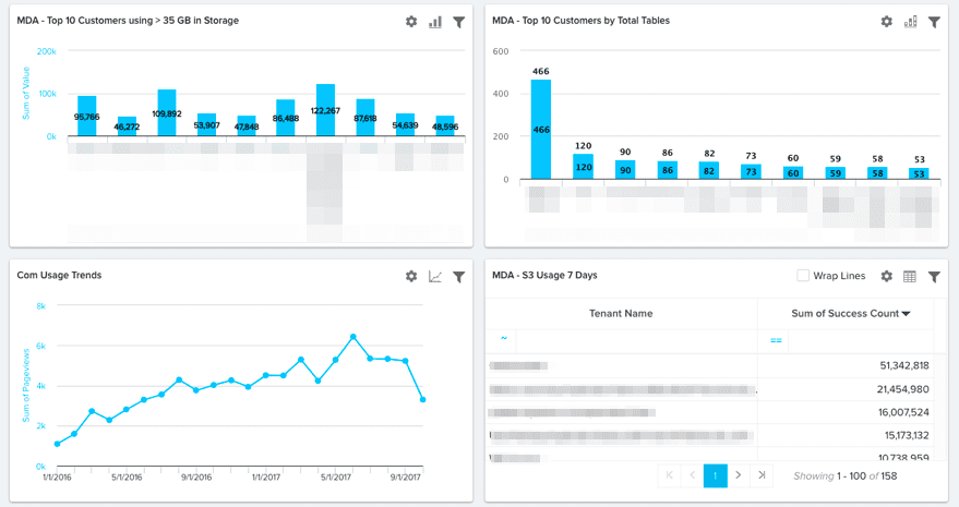 Every Product team has a dashboard of customer usage for their feature area. One of the areas I cover is MDA (Matrix Data Architecture) Data Management and Connectors. I can quickly open my dashboard to see the top customers using MDA—storage, number of objects, and who is using which connector.
