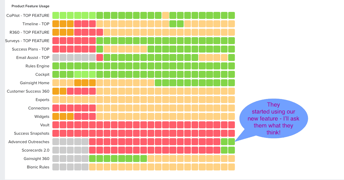 We leverage Gainsight to see how well a new feature it is being adopted. We also partner with our Client Outcomes team here to set metrics to track in Gainsight for driving this new adoption with customers. That way, both teams can measure our success in this area through Gainsight. Recently, we have been pretty excited about Timeline. We used our Gainsight data to show how Timeline is driving faster adoption, healthier customers, and improved end user NPS. This is a major motivator for us to double-down on that feature area!