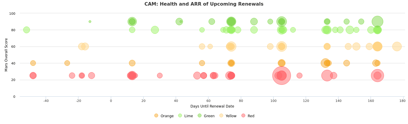 - Renewals: Here’s a figure I pulled from Gainsight I use to forecast our renewals by segment and by Customer Account Manager. As you can see below, I’m looking at a chart of our customers’ health by days until renewal. This allows us to better predict future revenue based on expected renewals at a glance. It also helps me know how my team is doing at any given time.