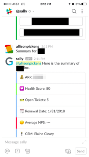 Executives are always on the go and need relevant, accurate, and easily accessible information—stat. Our executives, including Nick Mehta (CEO) and Allison Pickens (CCO), love using Sally. Sally is the Gainsight chatbot that lives inside the Slack mobile app. Sally preps them for onsite client meetings, tells them who the CSM is for the account, provides the health score for the client, and shows them detailed notes from previous client meetings. To learn more, check out Allison’s post on Sally here.