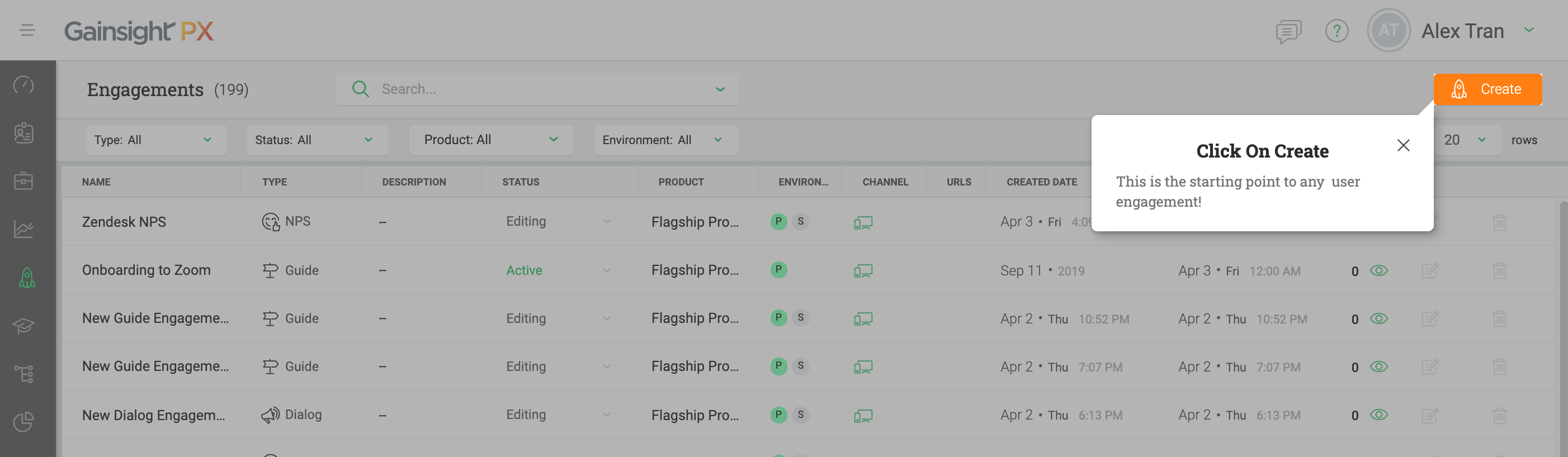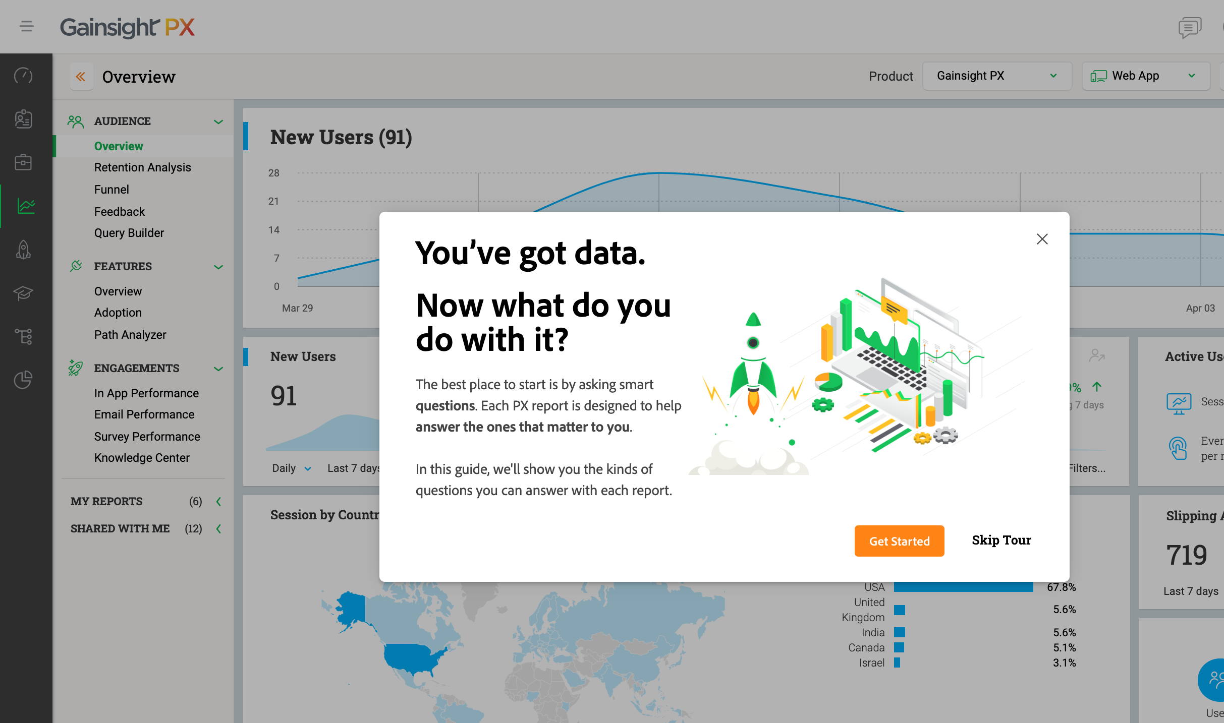For instance, first encourage users to toggle basic filters rather than to build a complex, custom report. In Gainsight PX, we use a quick tooltip as part of a guide to help new users start creating simple engagements.