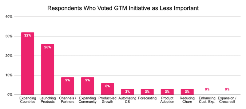 Cross-sell, Adding Partners, Automating Customer Success, and Improving Sales Forecasting all lead the way, and there’s a clear theme across these choices: durable and efficient growth. That sentiment is also reflected in the graph below, which asked respondents to vote for those initiatives they found less important.
