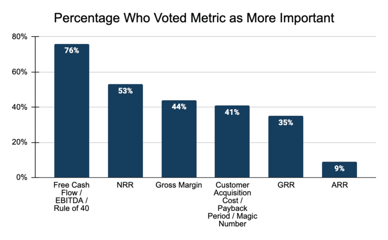 The Rule of 40 had the most overwhelming support. Virtually all respondents voted it as more important now, and that was followed closely by Net Revenue Retention. Even though CEOs voted the Rule of 40 as the most important, NRR was the only other metric that received a majority vote in every pool of respondents (Publicly-traded, Private Equity, and Cloud 100).