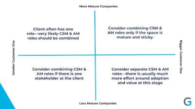 In businesses selling to SMBs, since the client often has one role, it’s easier to imagine a combined CSM and AM role. By contrast, since the target personas in an enterprise could be separate for commercial and product decisions, many companies employ separate CSM and AM teams. And businesses that sell to both segments might blend the roles for SMB clients and separate them for enterprise customers.