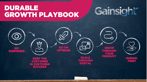 Mehta brought out Karl Rumelhart, Chief Product Officer and Executive Vice President at Gainsight, and Kellie Capote, Chief Customer Officer at Gainsight, to unveil a plan to not just survive this economic downturn, but thrive during it: the six-step Durable Growth Playbook.