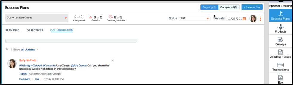 When a customer buys your product or service, they typically have bought it for a specific purpose(s). Record what those use cases were in Success Plans to keep your teams aligned on the customer’s priorities across sales and services handoffs and ensure you are executing to support those use cases.