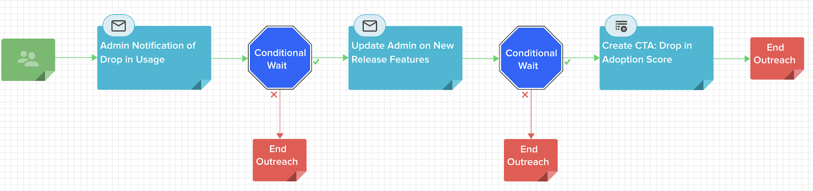 If you have a long tail of customers, you obviously cannot have a CSM be the first line of defense when it comes to deployment or adoption changes. It’s simply too unmanageable at scale. Using Gainsight’s Journey Orchestrator, you can create an automated journey for your long tail of customers. As your process matures, you can start combining your automated and manual outreaches.