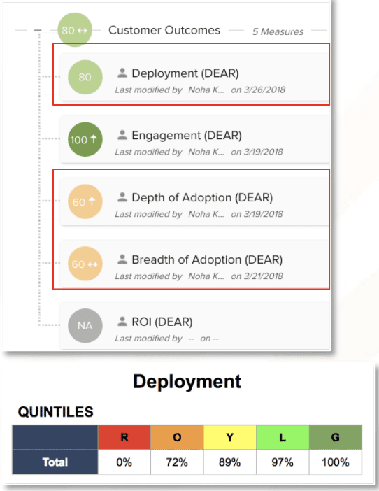 - Deployment: Whether your customers have activated something that they are entitled to, e.g., licenses activated, features enabled, onboarding/training completed, etc. The thinking here is straightforward: If they don’t activate it, they cannot adopt it.