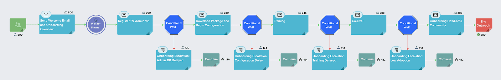 When you’re the hero of your customer’s journey, they’re expected to adapt to your processes. Which means they’re being forced into a box they never signed up for. But when they’re the hero, you need to be flexible enough to adapt when there are exceptions. In particular, Gainsight allows you to define “off-ramps” where journeys that aren’t going well (e.g., customer hasn’t sent first envelope within 30 days) can have escalations:
