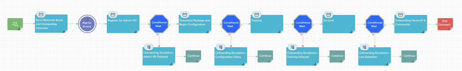 Gainsight includes a data-driven business process engine focused on the Customer Journey. As you can see from a simple example below, you can define part of a journey or all of a journey (e.g., onboarding), create data-driven triggers (e.g., once sign-up has happened), drive human (workflow) and digital (email) actions, all with the goal of delivering a consistent Customer Experience: