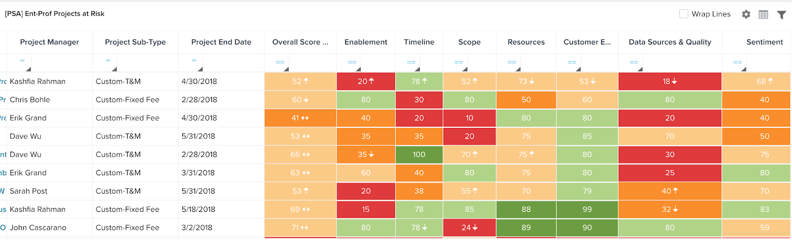 Compared with our previous process, scoring all projects across these risk areas each week provides a significant amount of actionable information for the Practice leaders and escalation managers. A few examples: