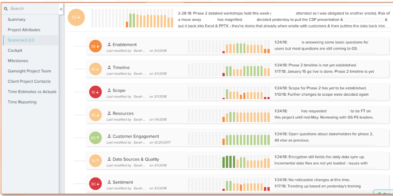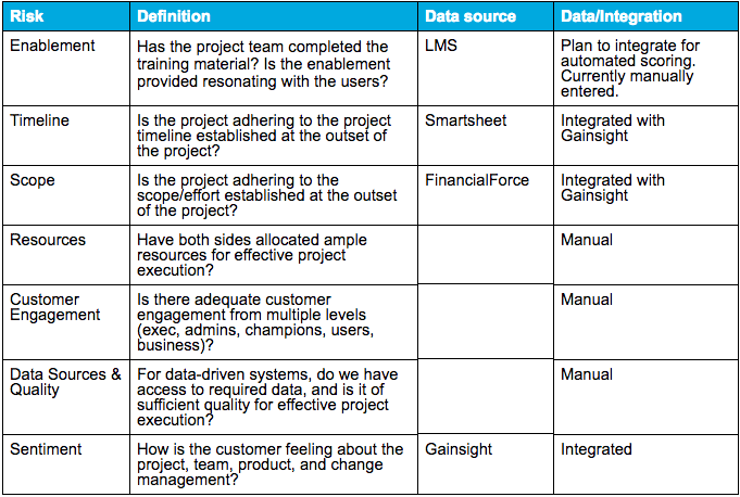 At Gainsight, all active projects are scored across seven risk areas with statuses and scores updated weekly. Here is how we define the risk areas and where we source the data: