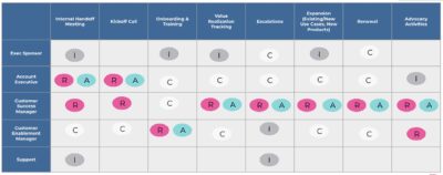 Once you’ve identified the moments of truth you want to build your digital CS strategy around, the next step is to revisit (or create) a RACI matrix for the customer journey. You’ll need to consider how roles and responsibilities change from high-touch playbooks to segments with more digital touchpoints. Here’s more context on the different roles to map out in your RACI: