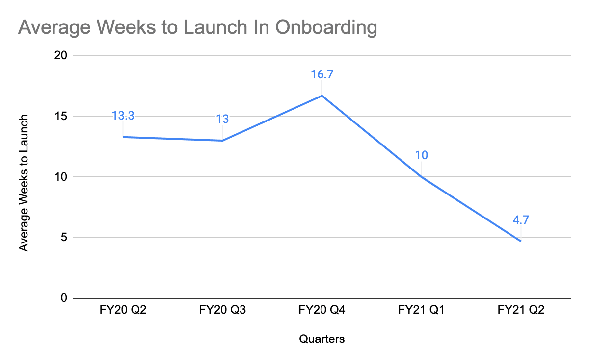 Now that we’ve implemented these changes to our implementation processes in Q1’21, our time to launch has dropped from an average of 13 weeks to 4 weeks—the fastest lasting nine days!
