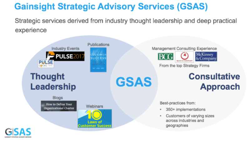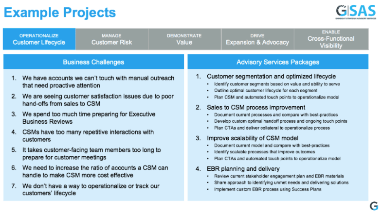 First, we aligned our advisory offerings specifically to our expertise—Customer Success. While third-party consulting firms offer services in a variety of areas, we customize our services to clients specifically tackling Customer Success challenges. For instance, we customize projects on broad topics like organizational strategy and change management to accelerate the value of Customer Success initiatives. Further, GSAS is uniquely positioned within the Post-Sales organization and collaborates closely with our technical onboarding team. This allows our clients to have their strategy operationalized in a tool to execute beyond the PowerPoint deck.