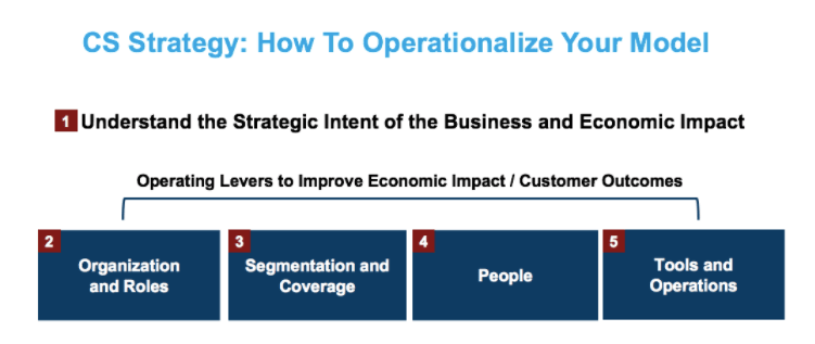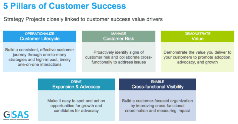 Once clients are aligned on the strategic intent of their CS initiative, it’s time to execute. At Gainsight, we think about these processes in terms of our 5 Pillars for Customer Success. Each pillar represents a key area that has a material impact on the top and bottom lines for a business.