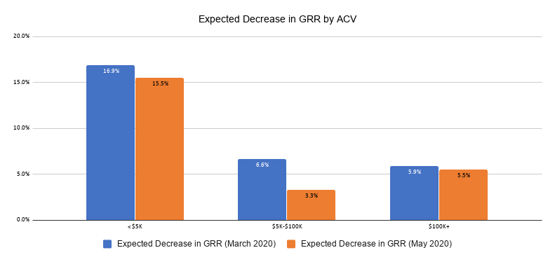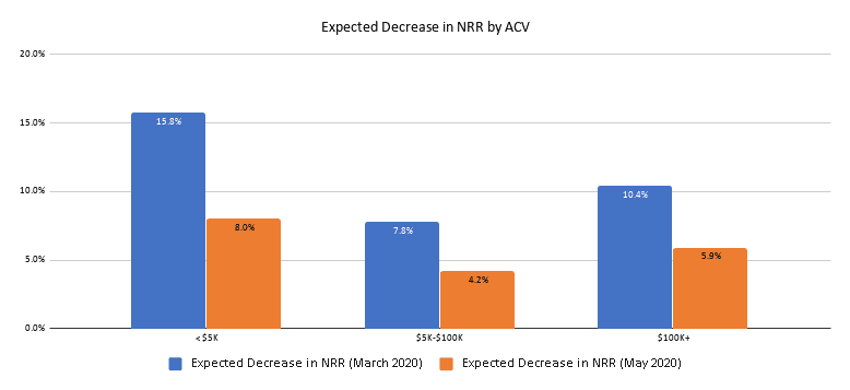Although respondents initially thought their Gross Renewal Rates (GRR) would decrease by 3-6% in enterprise segments and 17+% in SMB segments, all respondents now predict slightly less churn than they initially thought. We observe that most companies have by now triaged their installed base and quantified the COVID-19 risk. In addition, we anecdotally hear that the majority of incremental churn due to COVID-19 is not full churn (e.g., customers canceling) but is instead downsells and downgrades (e.g., fewer seats, lower prices, fewer modules, etc.)