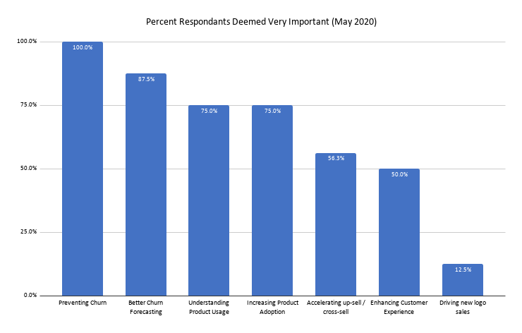 We asked participants to rate various initiatives as “very important,” “somewhat important,” or “not important.” 100% of companies ranked preventing churn as “very important.” Other important focuses included churn forecasting, understanding product usage, and increasing product adoption.
