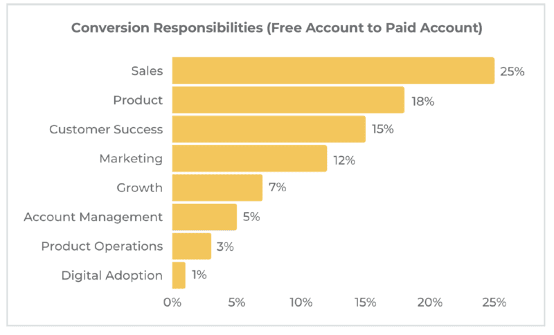 The Product organization is responsible for monitoring free account customers in 28% of cases, and converting free accounts to paid in 18% of cases. Conversely, sales is involved in conversion 25% of the time.