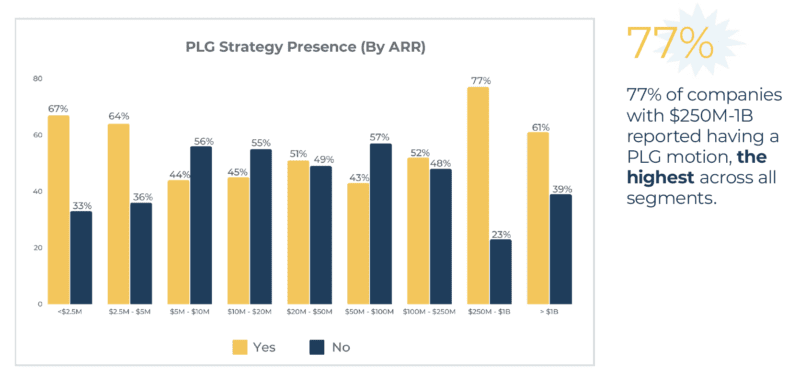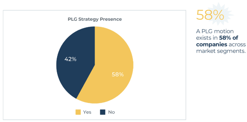- A PLG motion already exists in 58% of surveyed companies. The majority of organizations surveyed have already started a PLG motion, regardless of size or product type, with 40% having greater than $25K annual contract value (ACV).