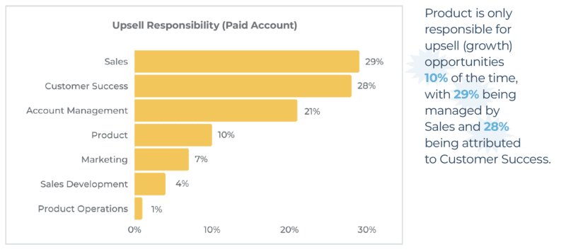 Product is only responsible for upsell (growth) opportunities 10% of the time, with 29% managed by Sales and 28% attributed to Customer Success.