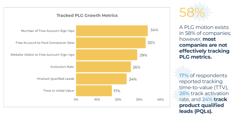 A PLG motion exists in 58% of companies; however, most companies are not effectively tracking PLG metrics. 17% of respondents reported tracking time-to-value (TTV), 26% track activation rate, and 24% track product qualified leads (PQLs).