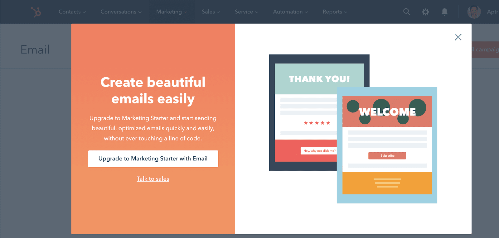 In this Hubspot example, they’ve determined that people using the Email feature will be interested in this upgrade. The promotion is relevant—users who receive it will at least be intrigued by the idea of “beautiful, optimized emails” that require no coding. What’s more, the CTA button gives the idea that upgrading will be quick and easy. But, if they need to talk to Sales, they also have that option.