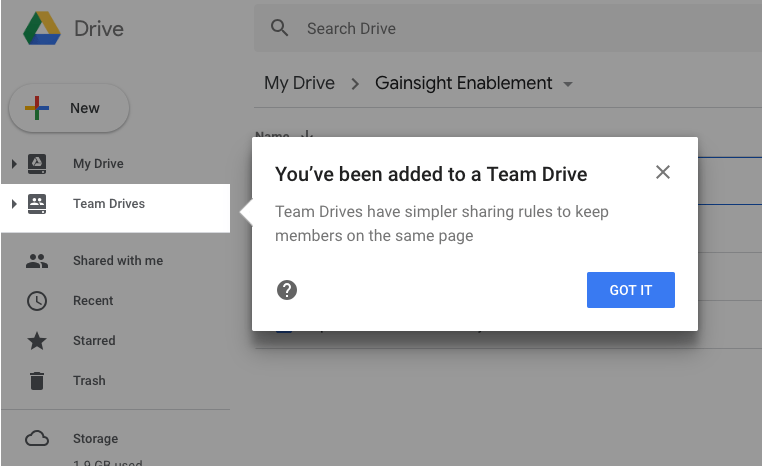 Google Drive facilitates (and relies on) collaboration between users. This in-app message is triggered at a critical moment: when a user is added to a Team Drive. It calls attention to the feature and explains its functionality. Now the user knows where to go to access shared Drives.