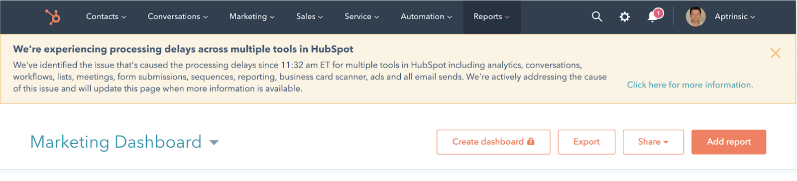 Hubspot hits both of these with their detailed in-app notification addressing processing delays. The CTA is also a key element and gives affected users a means to find more information. Pro-tip: Once your issue is resolved, close the loop by sending out an email to bring users back into your product.