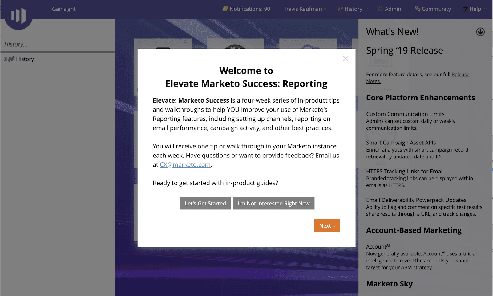 Complex features can be big hurdles for new users. If they’re not comfortable using a feature, they will never get the full value it can provide. Reporting is a huge component of Marketo’s value proposition but it can also be daunting if you’ve never used a similar tool. This in-app message is a good example of how you can reach out to users while they’re in a specific feature to offer them something relevant. It’s a great experience for the user because they’re getting help when they need it and it leads to successful outcomes because it’ll make the user more adept at that feature in the long run.
