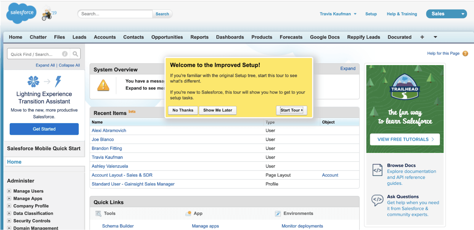 Salesforce used this in-app message to notify users of their improved setup. It also gives them three different call-to-actions (CTAs): No Thanks, Show Me Later, and Start Tour. It’s important to note that the messaging speaks to both old and new users and addresses their individual needs for the tour that’s provided. Personalization doesn’t have to be ultra-targeted, sometimes just including all possible segments in one clear message will do the trick!