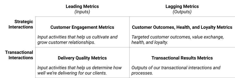 We’ll start with a framework. The 2×2 matrix below outlines four types of CX metrics. The types are based on whether they are leading or lagging indicators and whether they measure strategic or transactional customer interactions.