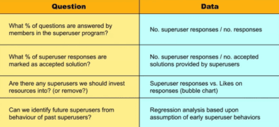 If the top users (or ‘superusers’ as he calls them) stay active and engaged within a community, engagement will remain high. He referred to superusers as the “lifeblood of any community.” This image is an example of how Millington works with his clients when strategizing how to keep their superusers best engaged: