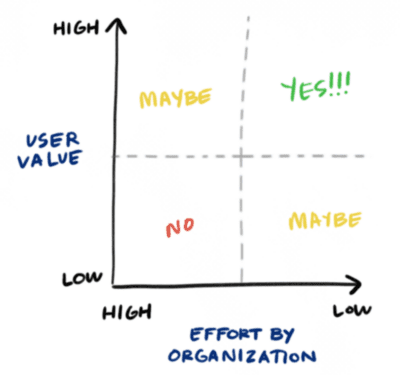 How do you know which goals to start with? A feasibility and impact analysis will help. Take your potential goals and rank them on a graph similar to the one below. Once you have everything plotted on the graph, start with the goals with high user value and low organizational effort (in the top-right quadrant). Those are your goals to start.