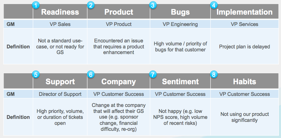 Note that some of these risk areas are “owned” by Customer Success; others are owned by other departments. I’ll come back to that distinction later in this post.