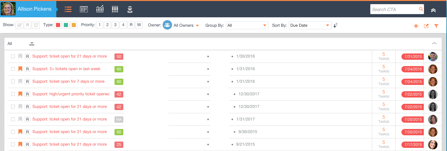 - Red: The CSM has “flagged” the Support Risk CTA, indicating a belief that the issue requires greater attention.