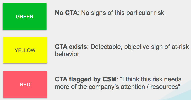 We created CTAs for each of these risk areas, to help the CSM know when s/he should get involved. In most cases, the CTAs are automated according to the definitions above. In others, the CTAs are created manually by the CSM.