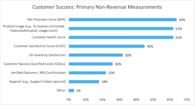 NPS is the number one non-revenue measure of CS organizations in Europe (64%). But while NPS is popular, the use cases vary quite a bit. Some CS organizations use NPS as an early signal of risk or opportunity. Others use this sentiment measure to drive advocacy by guiding promoters to leave a review, provide a case study, or be a reference. The key is to remember that NPS is primarily a measure of customer experience, rather than customer outcome.