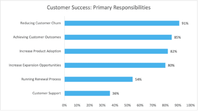 As in previous reports, CS is responsible for reducing churn, achieving customer outcomes, increasing product adoption, and identifying expansion opportunities. Expansion is becoming more and more a part of a CSM’s primary responsibilities, as they have the insight into whether an account is ready for an upsell or another product suite. It also highlights how CS is now driving growth and shifting away from Customer Support—down to 36% in this year’s report—showing that manual tasks are increasingly automated. This means CSMs are freed up to focus on more strategic conversations.